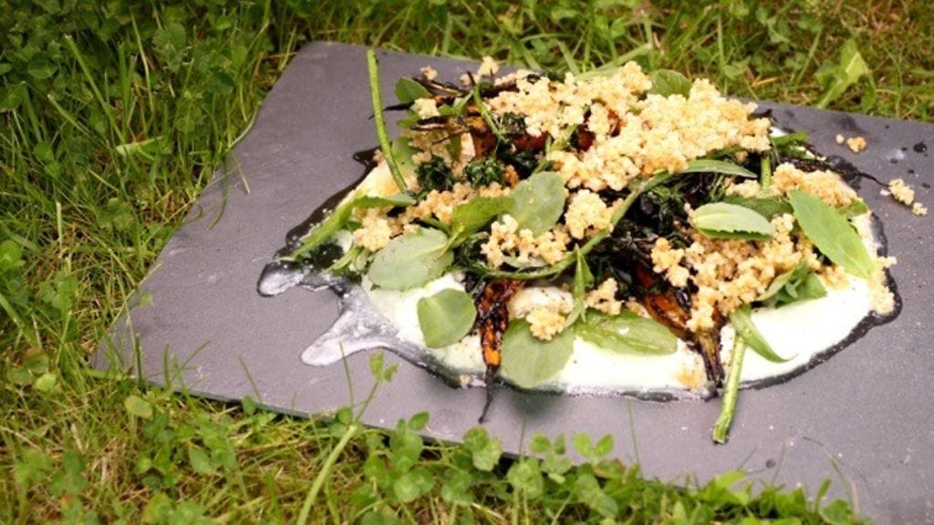 Mausta jogurtti sitruunan mehulla ja kuorella, suolalla ja mustapippurilla. Hienonna yrtit. Ota porkkanat pois grillistä, lisää vihreät varret grilliin ja anna ’hiiltyä’ 1-2 noin.