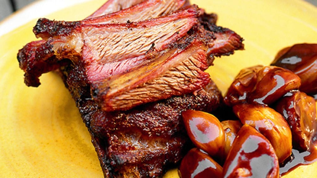 2. Hiero siankylki suolalla ja pippurilla. Voitele grillauskastikkeella kauttaaltaan. Grillaa käännelleen riittävän kaukana kuumimmasta hehkusta. Kypsyminen vie noin 30-35 minuuttia. Leikkaa kylki niin, että joka palaan tulee luu. Tarjoile loppukastike lihan ohella.