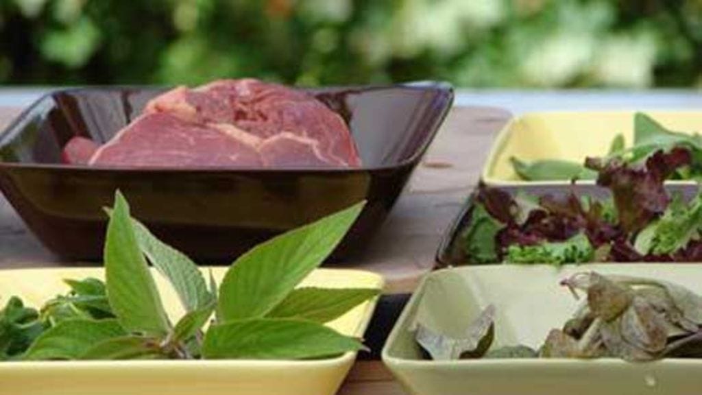 Paista pannulla naattisipulin puolikkaita ja valkosipulin kynsiä. Lisää pannulle pihvi. Paista sitä kunnes nesteet nousevat sen pinnalle ja vaihda puolta. Riko salaatinlehdet kevyesti käsin (veitsellä leikatessa salaatinlehti tummuu). Sekoita salaatti kastikkeeseen kevyesti ”heitellen”.