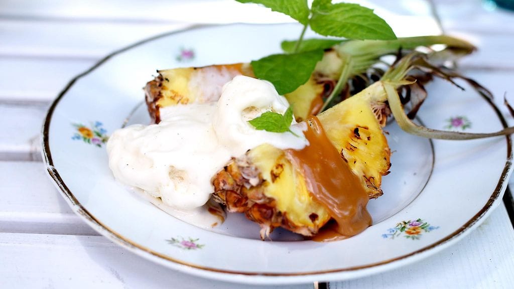 Leikkaa ananas lohkoiksi ja poista kova keskiosa. Grillaa ananaslohkoihin kullan ruskea pintaväri. Lusikoi sokeroitu kondensoitumaito pieneen kattilaan ja pidä kattilaa grillissä niin, että kastike notkistuu. Nosta ananakset lautasille, valuta päälle kinuskia ja tarjoile vaniljajäätelön kera.