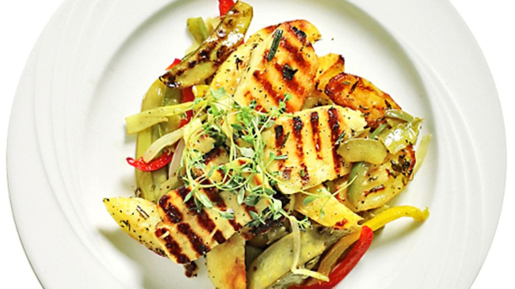 2. Viipaloi halloumi n. ½ cm paksuisiksi viipaleiksi. Penslaa oliiviöljyllä ja grillaa n. 1 minuutti kummaltakin puolelta kunnes juusto on saanut väriä. Ripottele päälle rosmariinia. Asettele wokatut vihannekset lautasille ja halloumiviipaleet niiden päälle. Tarjoile lohkoperunoiden kera.