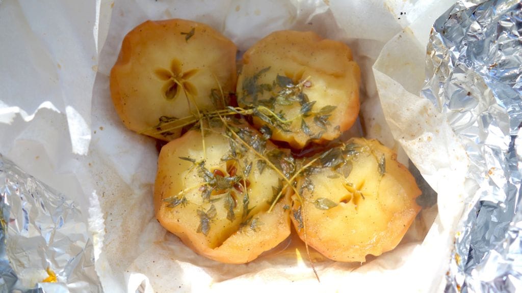 Laita puolitetut omenat leikkuupinta ylöspäin leivinpaperilla vuoratun alumiinifolion päälle. Mausta omenat suolalla, pippurilla, hunajalla ja tuoreella timjamilla. Kääri omenanyytit ja laita grilliin. Grillaa 15-20 minuuttia.