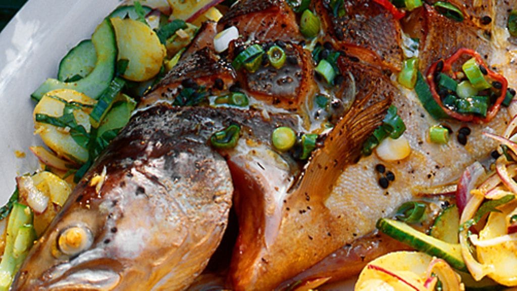 3. Sekoita retiisit ja perunasekoitus ja levitä se suurelle tarjoiluvadille. Poista lohesta puuvillalanka ja yrtit, aseta perunapedille. Tarjoile heti.