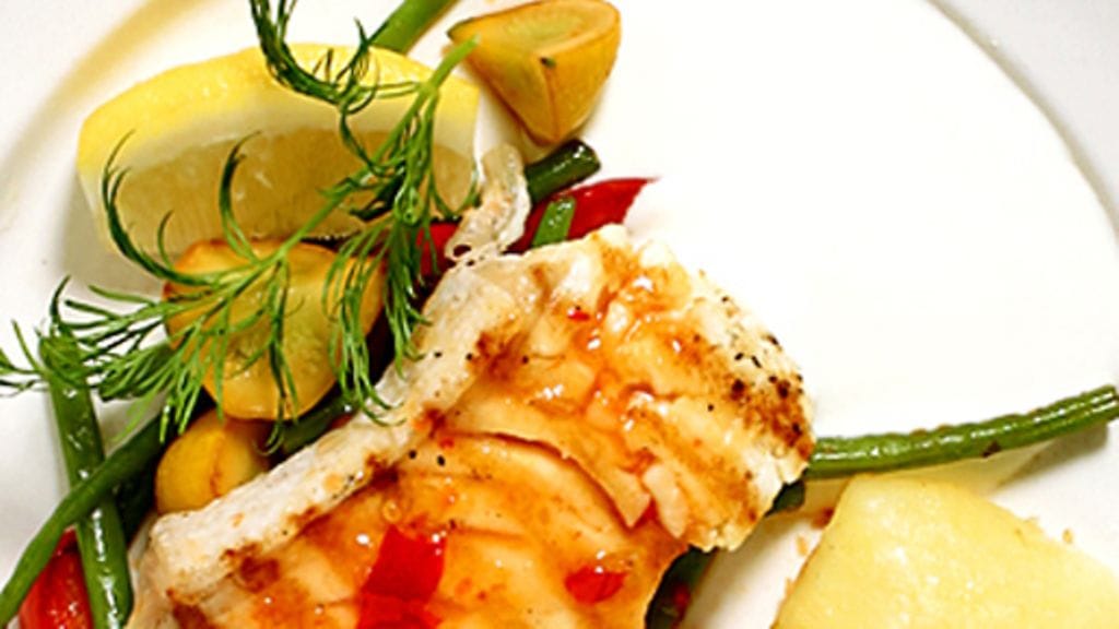 3. Grillaa kalaviipaleita 4 minuuttia molemmin puolin. Jos viipaleet ovat kovin paksuja, niitä voi jälkikypsentää 100-asteisessa uunissa 2-4 minuuttia. Tarjoile kalat lämpimiltä lautasilta. Koristele sitruunalla, tomaatilla ja kapriksilla.