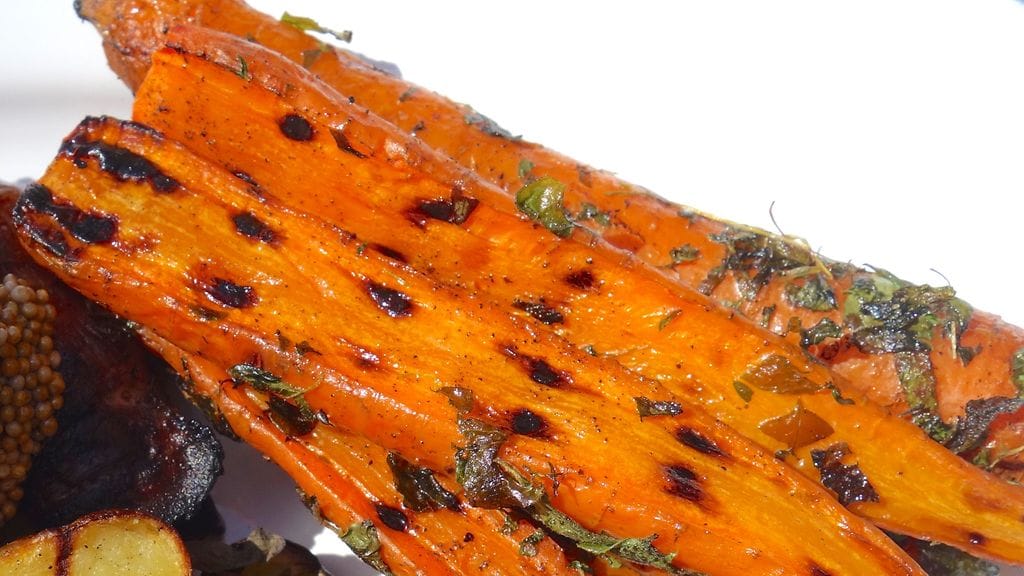 Leikkaa porkkanat pituussuunnassa puoliksi ja laita ne leikkauspinta alaspäin grilliin. Grillaa viisi minuuttia. Laita grillatut porkkanat kulhoon ja sekoita joukkoon Provence yrtit. Mausta suolalla ja pippurilla.
