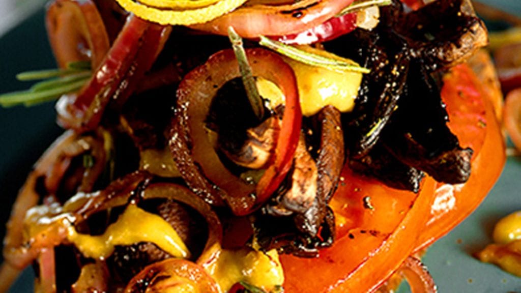 3. Penslaa sienihatut oliiviöljyllä ja grillaa n. 2 minuuttia molemmin puolin. Mausta suolalla ja pippurilla. Laita tomaattiviipaleet sienille, asettele päällimmäiseksi sipulisalaattia.