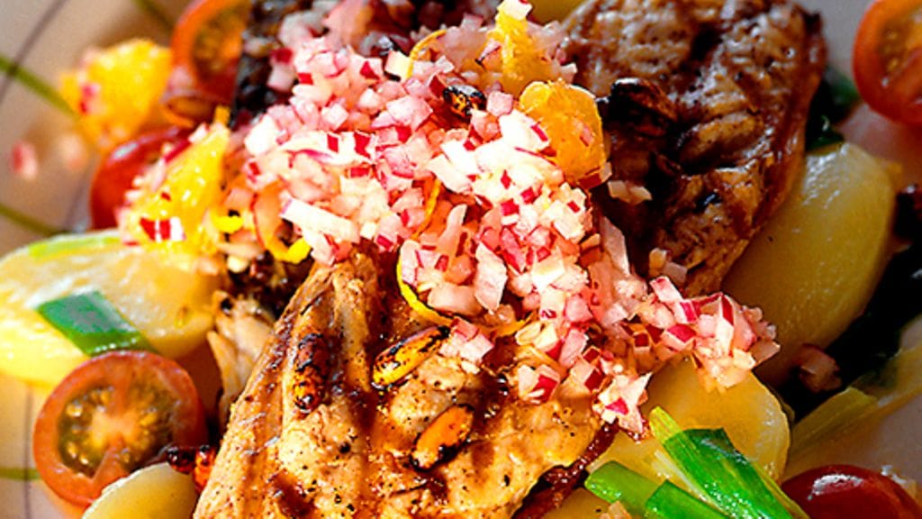 5. Grillaa kalafileet kauniin ruudullisiksi. Mausta. Asettele lautasille, koristele pinjansiemenillä ja punasipulilla.