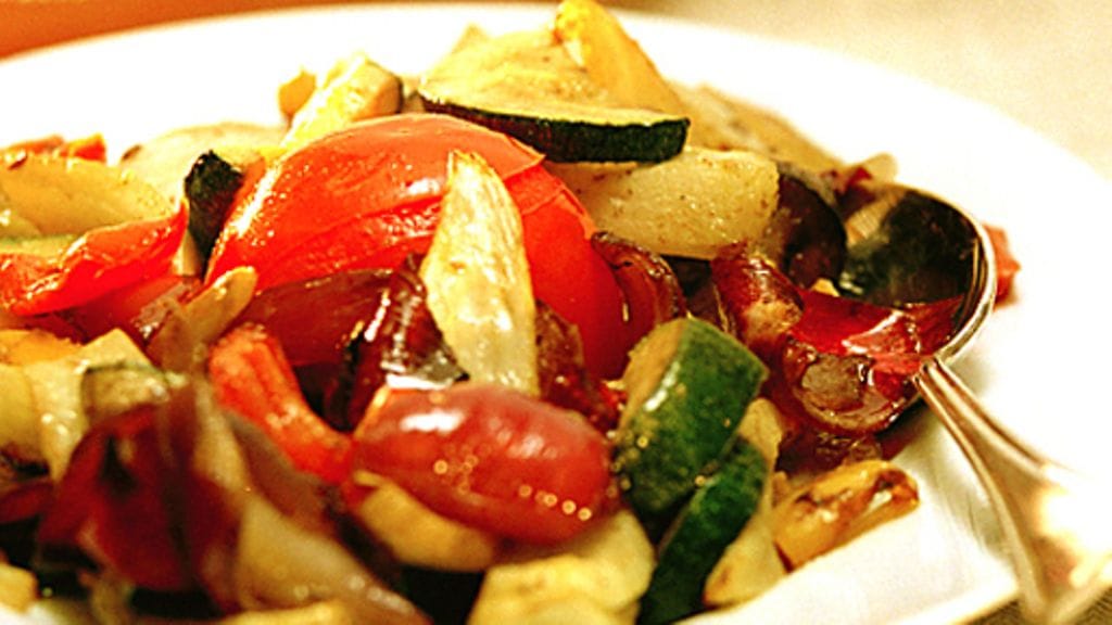 2. Kuumenna uuni 200 asteeseen. Laita vihannekset kulhoon ja kääntele niitä öljyssä, grillaa ne sitten ulkogrillissä tai uritetussa grillipannusa 10 minuuttia. Kääntele vihanneksia silloin tällöin kunnes ne ovat saaneet kunnolla väriä.