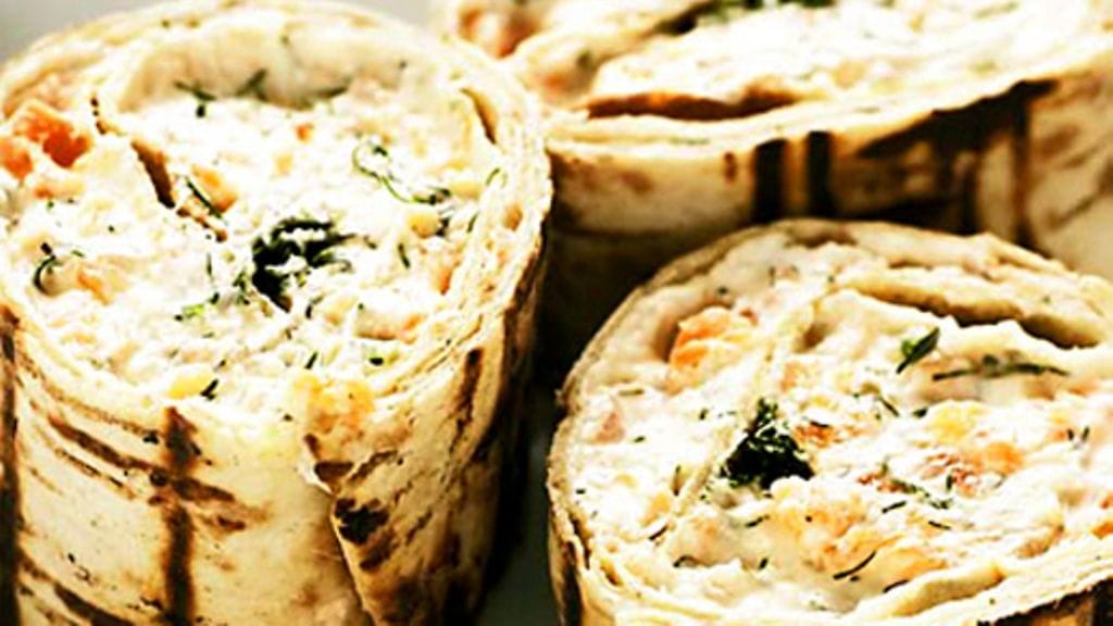 2. Jaa lohitahna rieskoille ja kääri ne napakasti rullalle. Kietaise kääröt alumiinifolioon ja kiinnitä päistä kiertämällä kuin karamellit. Tämän kaiken voit tehdä ennakkoon.