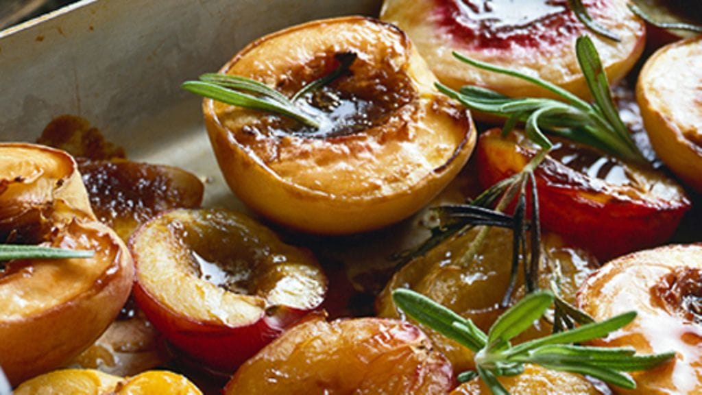 3. Norota hunajaa kuumille persikoilla ja ripottele päälle rosmariinia.