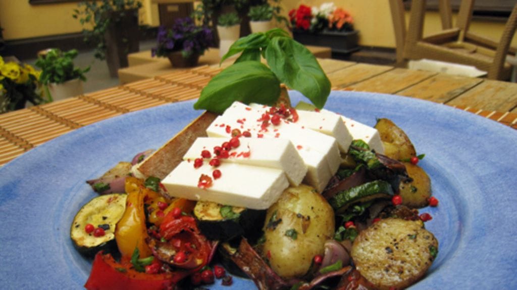 Kaada kastike kasvisten päälle ja sekoita kahdella lusikalla, niin että kastike imeytyy tasaisesti kasviksiin. Ripottele pinnalle hienonnettua persiljaa tai basilikaa sekä fetajuustoa.