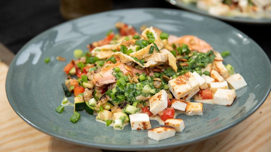 Keitä kvinoa pakkauksen ohjeen mukaan. Grillaa paprikaa ja kesäkurpitsaa kunnes ne ovat saaneet väriä. Pilko kasvikset ja sekoita kvinoa niiden joukkoon. Lisää paprika- ja valkosipulijauhetta.
