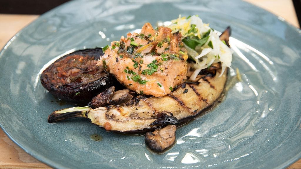 Halkaise munakoiso 6 osaan ja ripottele päälle suolaa. Anna munakoisojen ”itkeä” hetki. Voitele munakoisoviipaleet oliiviöljyllä ja laita ne grilliin. Kun munakoisoviipaleet ovat kypsiä ja saaneet kauniin pinnan, ota ne pois grillistä. Lisää viipaleiden päälle oliiviöljyä.