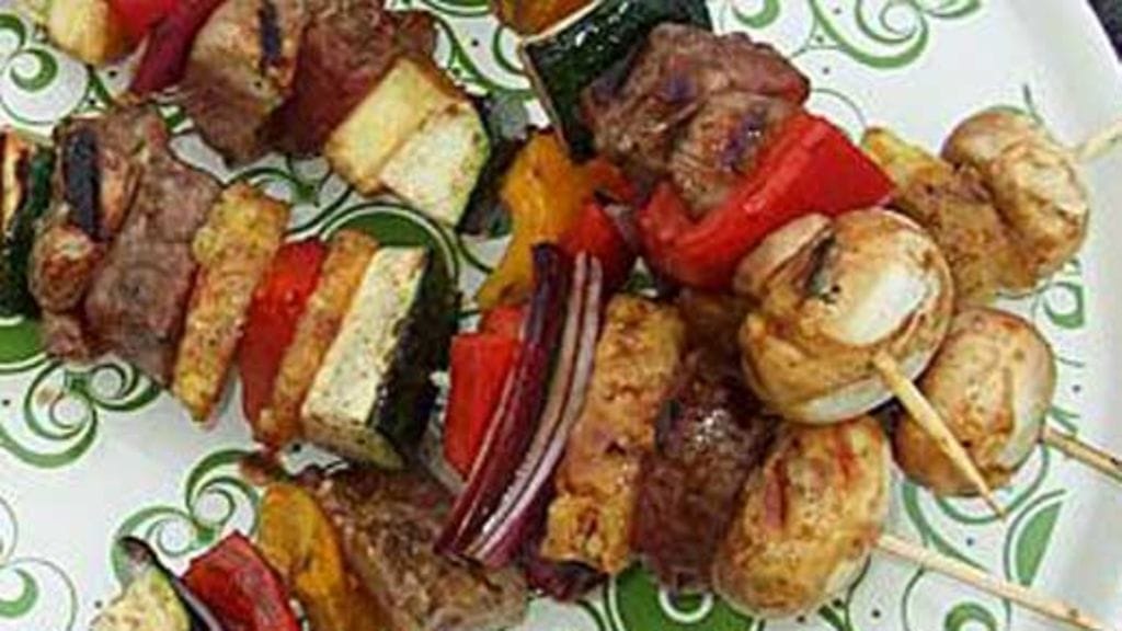Sekoita marinadi ainekset kulhossa ja leikkaa joukkoon kaikki vartaaseen tulevat raaka-aineet. Anna maustua tunnin ajan ja pujota ne sen jälkeen vartaisiin.