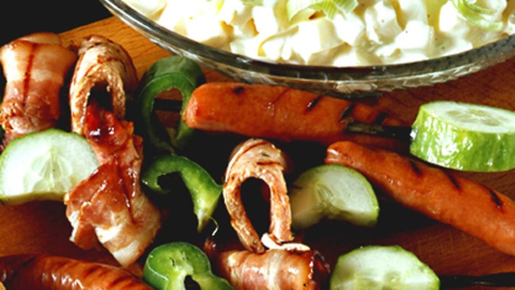 3. Leikkaa kasslerviipaleet puolikkaiksi ja pujota ne grillivartaisiin yhdessä nakkien, pekonirullien ja kurkku- sekä paprikapalojen kanssa.