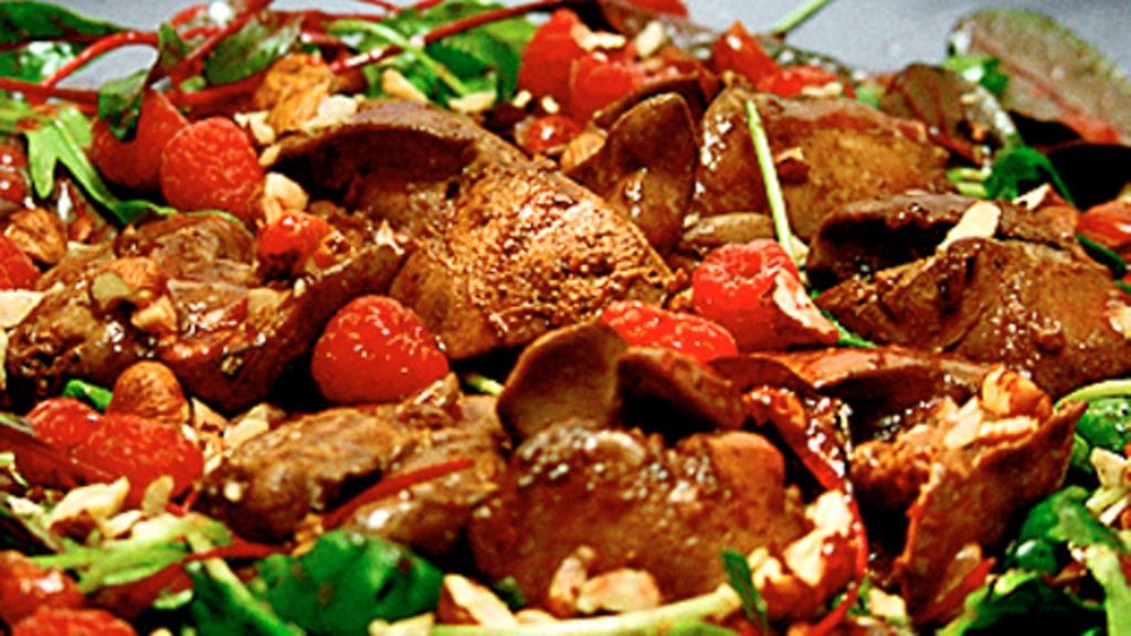 3. Paahda broilerinmaksat nopeasti kuumassa paistinpannussa, kaada päälle vähän marinadia ja anna kiehua niin että neste haihtuu. Maksojen pitää olla rosanvärisiä sisältä. Sekoita keskenään vihreät salaattiainekset ja jaa ne neljälle lautaselle, ripottele päälle vadelmat. Nosta maksat salaattipedille, valuta kastike ympäriinsä annoksille ja ripottele viimeiseksi pähkinärouhe.