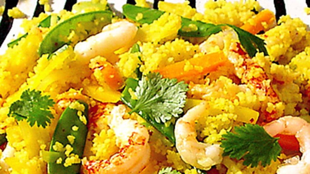 3. Lisää liemeen vihannekset, kiehauta jälleen. Kaada vihannekset liemineen couoscousryynien päälle. Anna seistä 5 minuuttia. Sekoita äyriäiset joukkoon juuri ennen tarjoilua.