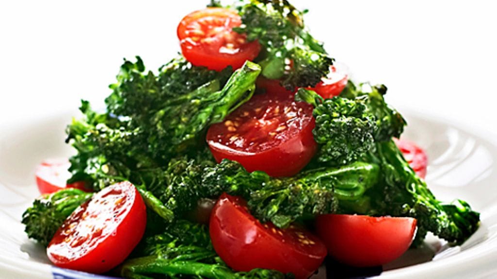 3. Nosta parsakaalit samalle vadille tomaattien kanssa. Tiputtele päälle balsamicoa ja loput oliiviöljystä ja kääntele varovasti.