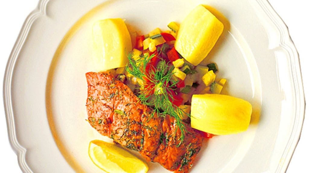 3. Halstraa kalafileet oikein kuumassa paistinpannussa tai grillissä, tarjoile heti vihannespyttipannun kera. Koristele tillillä ja sitruunalla.