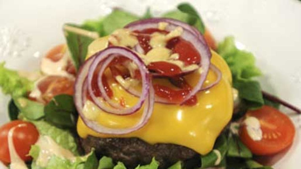 Laita lautaselle salaattisekoitusta, kirsikkatomaatteja ja lorauta salaatin päälle salaattikastiketta. Seuraavaksi aseta jauhelihapihvi salaatin päälle. Lisää lopuksi pihvin päälle cheddarjuuston siivu, ketsuppia, sinappia ja sipulirenkaita.
