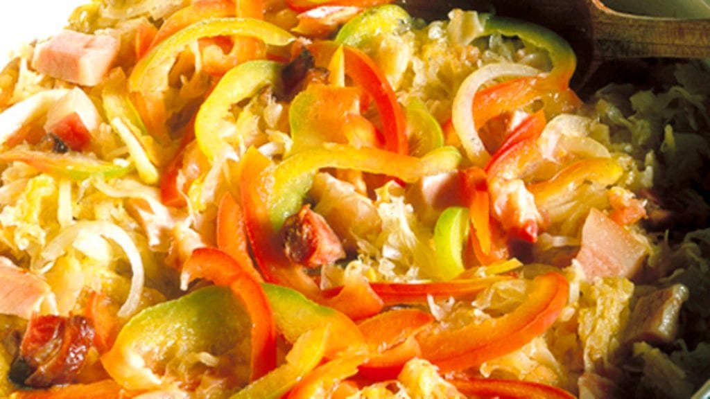 1. Kuullota sipuli, paprika ja kasslerkuutiot voissa padan pohjalla, kunnes sipuli on läpikuultavaa.