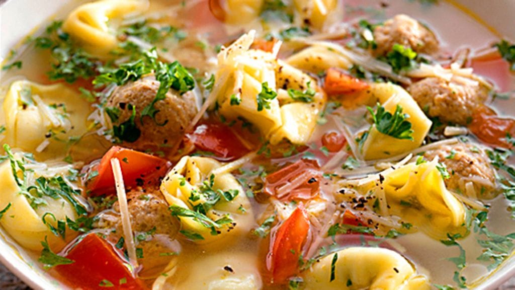 3. Lohko tomaatit. Siivilöi lihaliemi, kaada takaisin kattilaan, lisää tomaattilohkot ja kuumenna kiehuvaksi viimeisen kerran. Jaa tortellinit ja frikadellit lämpimille lautasille, nosta mukaan tomaattilohkot ja kauho lopuksi kuuma liemi päälle. Tipauta muutama pisara oliiviöljyä annoksille ja tarjoile lisäksi parmesaaniraastetta.