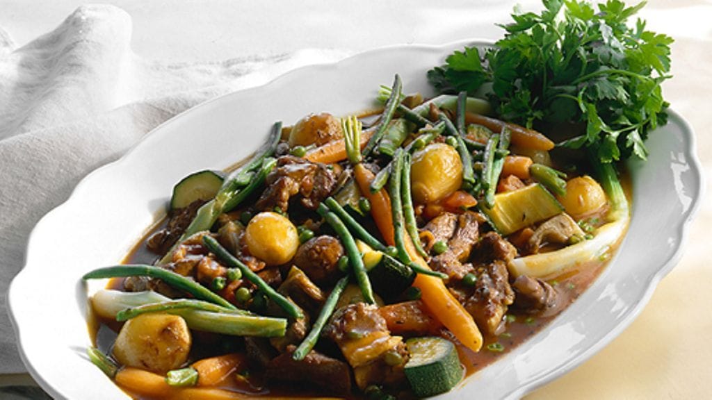 1. Leikkaa liha kuutioiksi ja ruskista kuutiot voissa pienissä erissä. Nosta paistetut lihat pataan. Sirottele lihojen päälle jauhoa ja sekoita hyvin. Lisää suola, timjami ja jauhettu pippuri ja lopuksi lihaliemi sekoittaen. Kuumenna kiehuvaksi ja anna kiehua hiljaa poreillen kannella peitettynä noin 45 minuuttia.