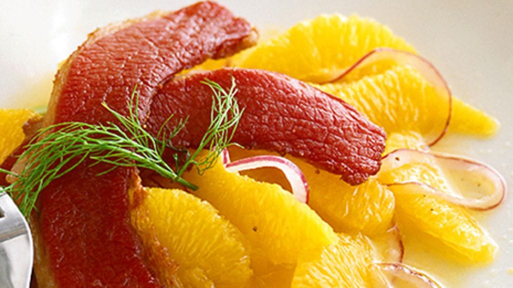 2. Kuori ja viipaloi punasipuli erittäin ohuiksi siivuiksi ja purista sitruunasta mehu. Sekoita yhteen sitruunamehu, appelsiinimehu, sokeri, suola sekä rouhittu pippuri ja kääntele kastikkeeseen appelsiini- ja punasipuliviipaleet. Jaa salaatti neljälle asetille.