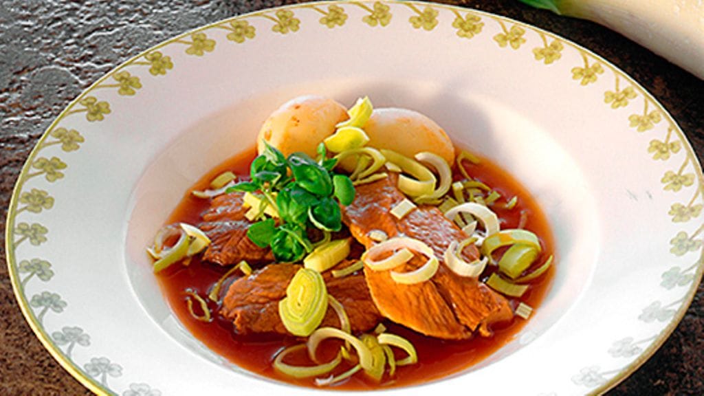 3. Viipaloi häränrinta, ota erilliseen kattilaan tilkka lihalientä ja lämmitä viipaleet siinä. Puhdista ja suikaloi purjo hienoksi. Nosta häränlihasiivut lämpimille lautasille, kaada päälle kuumaa kirkasta lientä ja sirottele pinnalle purjosuikaleita. Koristele tuoreilla yrteillä ja tarjoile heti.