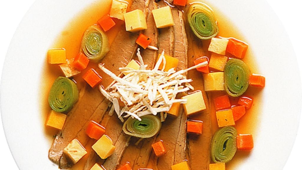 2. Lisää kattilaan mausteet, sipuli, valkosipuli, persilja ja juurekset (ei niitä, jotka on tarkoitettu tarjoiluun). Keittele hiljaisella tulella parisen tuntia, eli kunnes liha irtoaa luusta ja liha tuntuu murealta. Nosta liha kattilasta. Siivilöi liemi ja keitä tarjoiluun tarkoitetut juurekset kypsiksi siinä. Tämän kaiken voit tehdä etukäteen. Poista lihasta luu(t), kun se on vielä hieman lämmintä. Kun liha on jäähtynyt, voit laittaa sen jääkaappiin vadille painon alle, esim. sopivankokoinen leikkuulauta ja sen päälle vaikkapa säilykepurkkeja tms. Viileässä painon alla ollut liha on helppo viipaloida. Pidä myös keitetyt juurekset ja lihaliemi jääkaapissa.