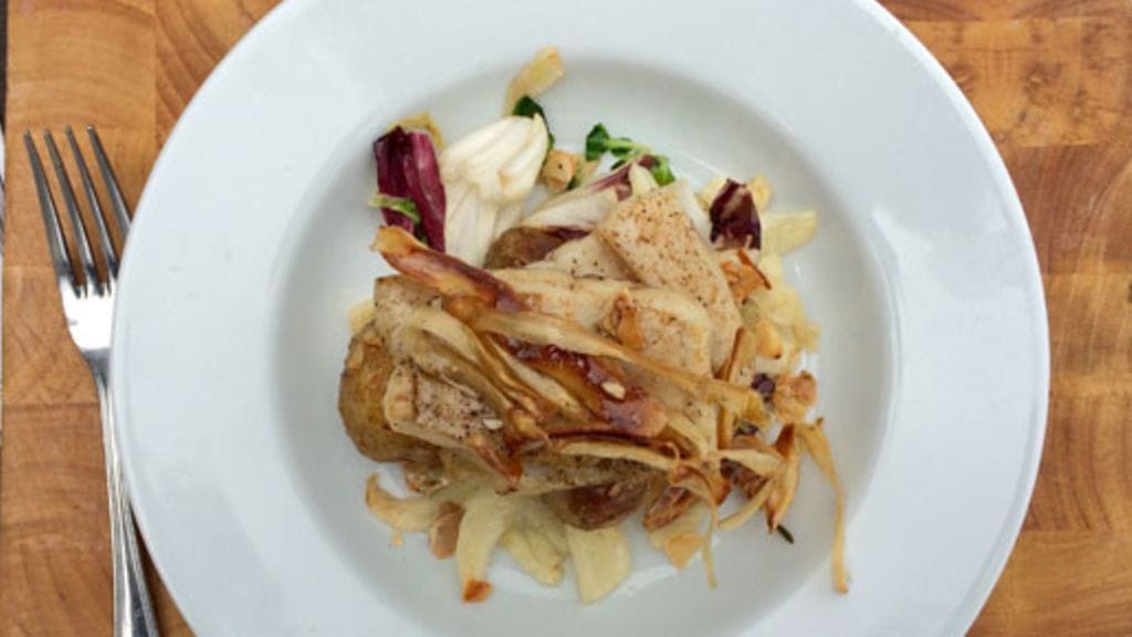 Poista tarvittaessa haukifileestä ruodot (ohje löytyy videona Youtubesta). Leikkaa haukifilee haluttuun annoskokoon ja mausta suolalla ja pippurilla. Kuumenna pannu ja paista haukipalat voissa piparjuurilastujen kanssa. Tarjoa hauki paistetun fenkolin ja sydänsalaatin kanssa.