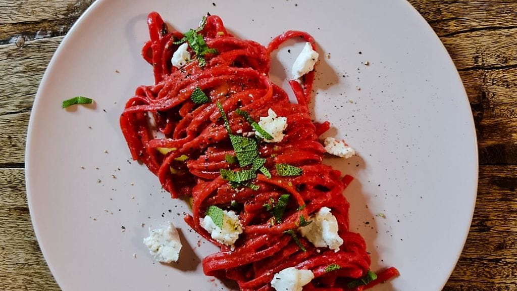 - Kaada kasvisliemi sekaan ja kiehauta. Lisää punajuuriraaste ja sekoita.