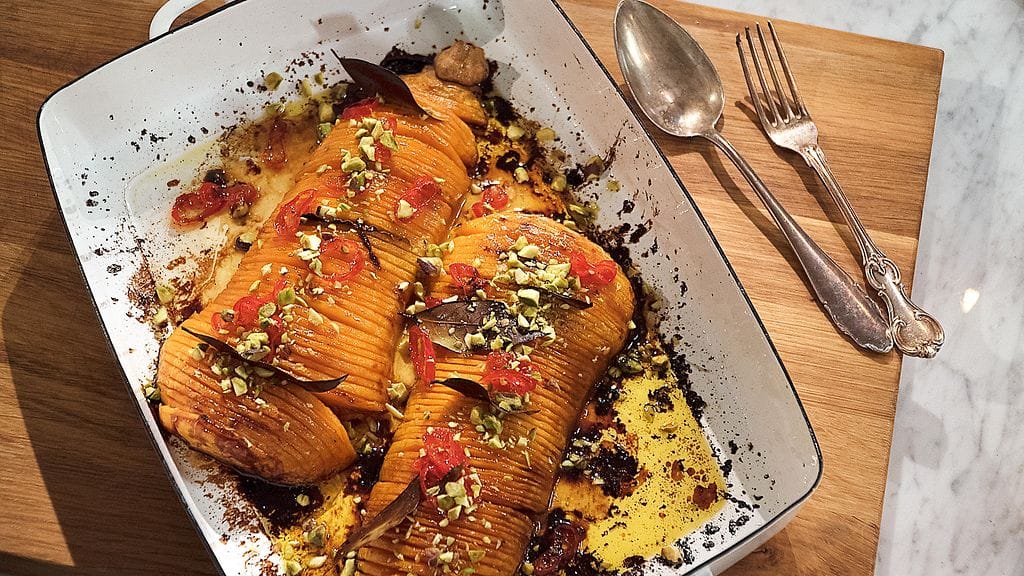 Laita kurpitsa takaisin uunivuokaan ja sudi siirapilla, työnnä laakerinlehdet viiltoihin. Nosta kurpitsa uuniin ja sudi muutaman kerran kypsennyksen aikana siirapilla. Anna kypsyä noin 30 minuuttia tai kunnes kurpitsa on kauniin karamellisoitunut pinnasta.