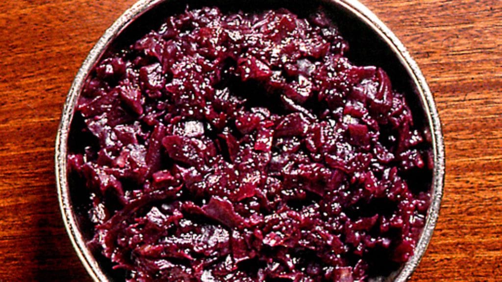 3. Lisää omenaviipaleet, punaviini, kinkun paistoliemi, viinietikka, sokeri, suola ja pippuri. Hauduta kannen alla 1-1½ tuntia. Sekoita välillä, ettei kaali pala pohjaan. Lisää tarvittaessa kinkun paistolientä tai punaviiniä. Vinkki: Kaali säilyy kauniin punaisena, jos valmiiksi hautuneen kaalin joukkoon lisätään pari etikkapisaraa.