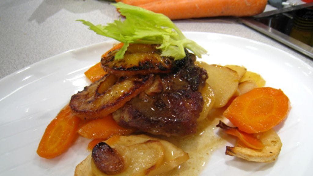 Paista myös ananasrenkaat ja nosta lihojen päälle. Kaada myös ananasmehu vuokaan. Lämmitä uuni 175 asteeseen ja hauduta pihvejä ja juureksia siellä reilun tunnin verran.