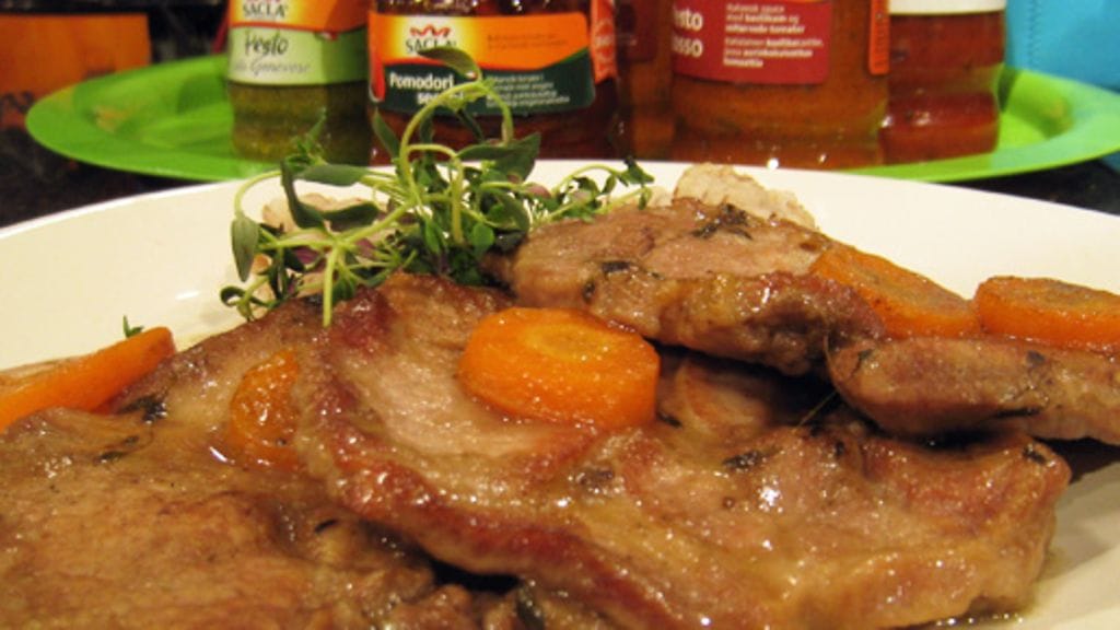 Leikkaa liha ohuiksi pihveiksi ja pyöräytä ne vehnäjauhoissa. Paista pihvit pannulla molemmin puolin ja nosta ne limittäin uunivuokaan. Mausta yrteillä, pippureilla, porkkanaviipaleilla, etikalla ja suolalla. Kaada päälle vettä niin, että lihat peittyvät juuri ja juuri. Peitä vuoka kannella tai foliolla ja nosta 180-asteiseen uuniin. Hauduta pari tuntia.
