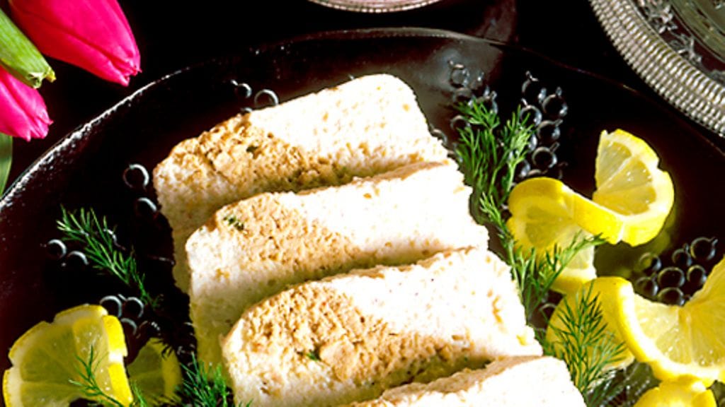 4. Kuumenna uuni 175 asteeseen. Voitele pitkänomainen leipävuoka. Pane vuoka kyljelleen ja lusikoi vuoan toiselle reunalle puolet haukimurekkeesta, lusikoi sitten savusilakkamureke keskelle ja täytä lopuksi toinen reuna haukimurekkeella. Käännä vuoka pohjalleen ja tasoita pinta.