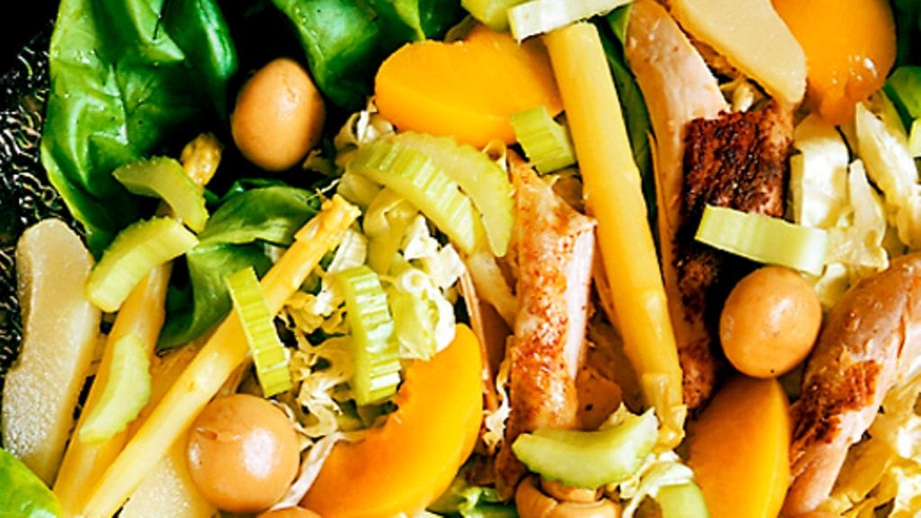 3. Asettele tarjoiluvadille salaattia, suikaloitua selleriä, parsaa ja kokonaisia pieniä herkkusieniä. Lohko hedelmät ja asettele ne sekä kanapalat vadille. Tarjoile kastikkeen kanssa.