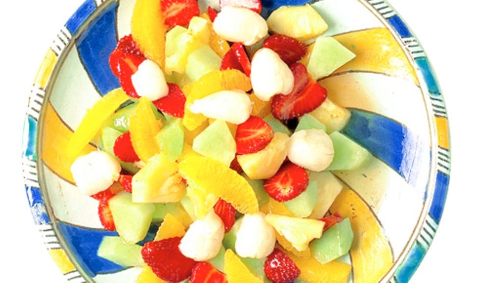 3. Sekoita hedelmät vadilla ja kaada sokeriliemi päälle. Anna hedelmäsalaatin tekeytyä jääkaapissa 1 tunti ennen tarjoilua.