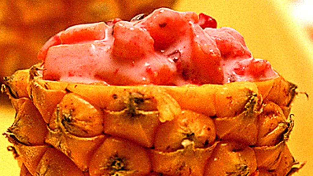 3. Paloittele papaija yhtä suuriksi paloiksi kuin ananas ja sekoita hyvin. Kun marjat ovat jäähtyneet, sekoita ne ananaksen ja papaijan kanssa ja kääntele jogurttiin. Täytä ananaksenkuoret sekoituksella ja tarjoile.