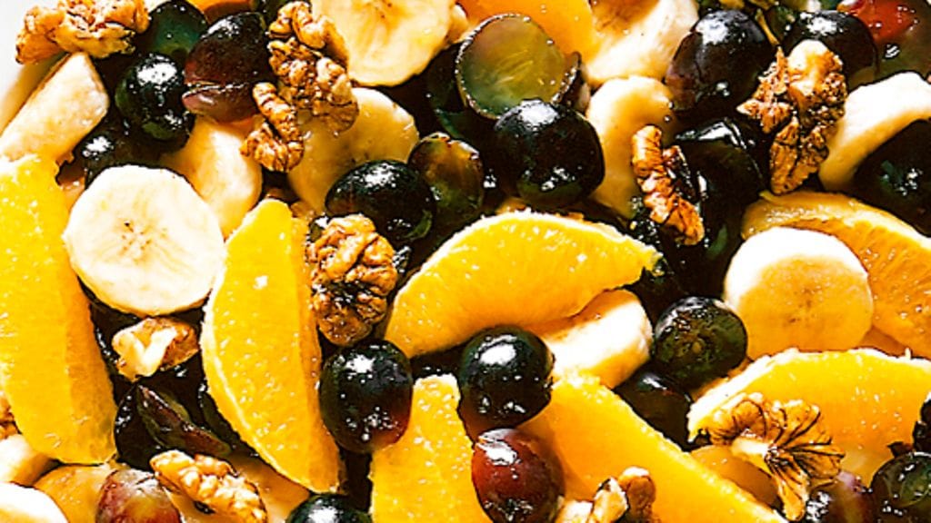 Tämä on helppoa ja virkistävän maukasta. Valmista hedelmäsalaatti hyvissä ajoin ennen tarjoilua, jotta maut ehtivät kehittyä. Jos löydät kivettömiä viinirypäleitä, niitä ei tarvitse halkaista.