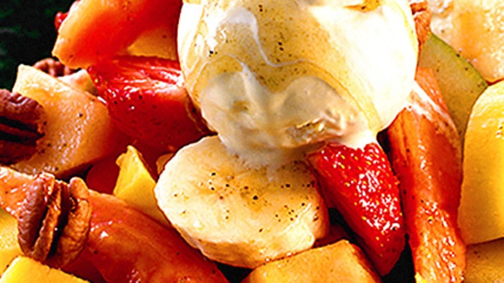 3. Asettele hedelmät lautasille, laita jokaiselle annokselle jäätelöpallo. Ripottele päälle pähkinät ja viimeistele hunajalla.