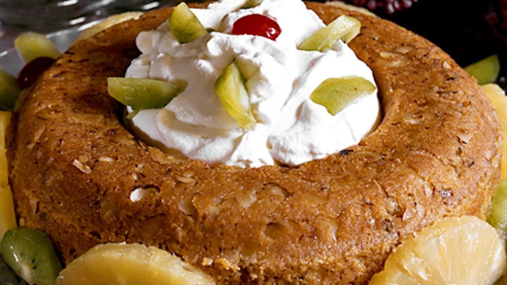 5. Kumoa kakku vadille. Vatkaa kerma ja täytä kakkurengas sillä, koristele hedelmillä ja marjoilla.