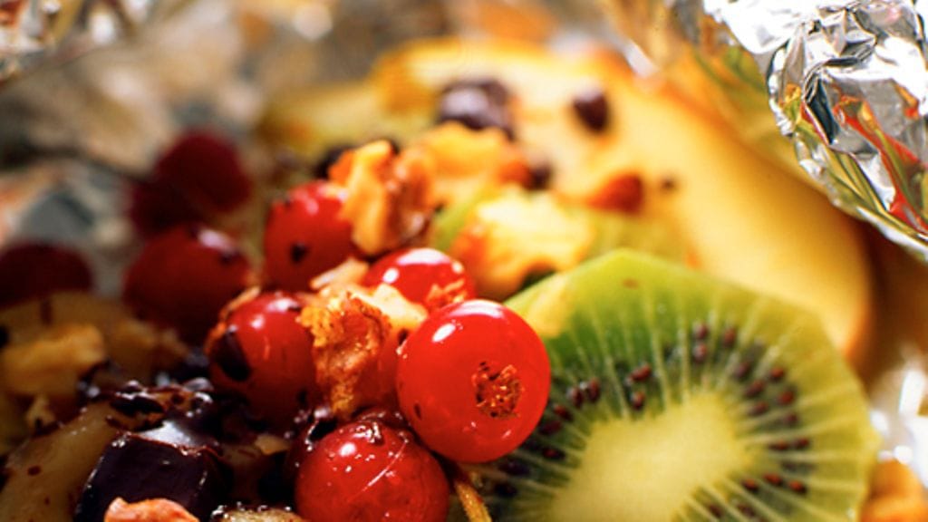 2. Pane hedelmäpaloja ja marjaterttu foliopalalle. Lisää päälle nokare voita ja tilkka likööriä. Taita folio paketiksi ja nosta grillille. Grillaa noin 10 minuuttia.
