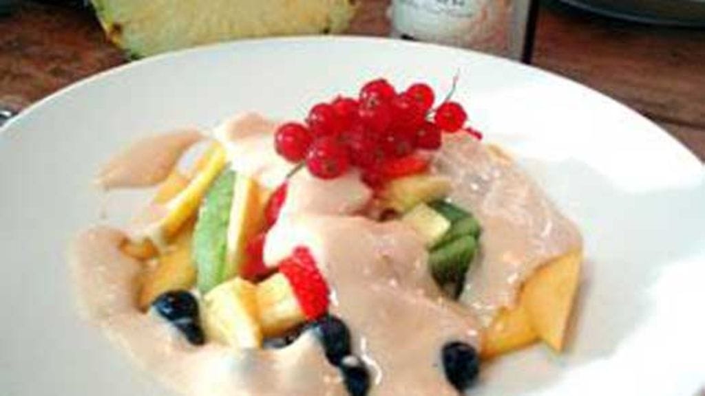 Kypsennä sabayon kovasti vispaten vesihauteessa, kunnes se sakenee kuohkeaksi kastikkeeksi. Anna jäähtyä ja tarjoile hedelmien kera.