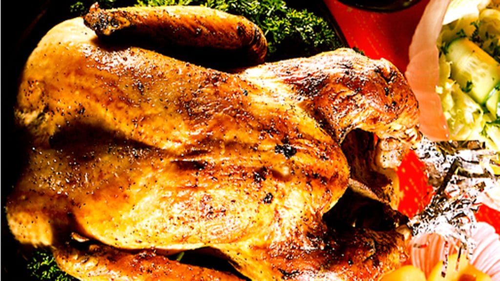 3. Lisää liemi ja paista uunissa 1 ½-2 tuntia, kunnes linnusta tihkuva neste on läpinäkyvää. Kääntele lintua puolen tunnin välein ja penslaa voisulalla. Siivilöi liemi, lisää siihen kermaa ja keitä kokoon kastikkeeksi.