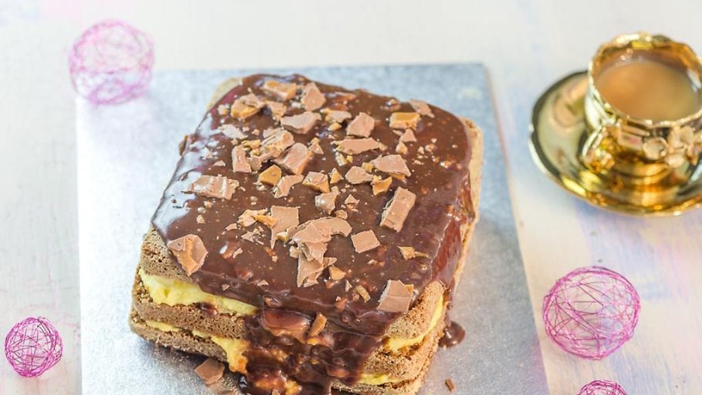 Anna jäähtyä hetki ja kumoa vuoasta. Jäähdytä. Leikkaa torttu kahteen tai kolmeen osaan. Valuta säilykepäärynät ja leikkaa suikaleiksi tai kuutioiksi.Sekoita vaniljakreemijauhe ja maito keskenään ja anna seoksen jähmettyä.Levitä vaniljakreemi torttulevyjen väliin. Ripottele kreemin pinnalle päärynäpalat.