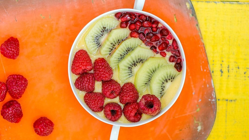 Laita seos kulhoon ja koristele kiiwiviipaleilla, vadelmilla ja granaattiomenansiemenillä.