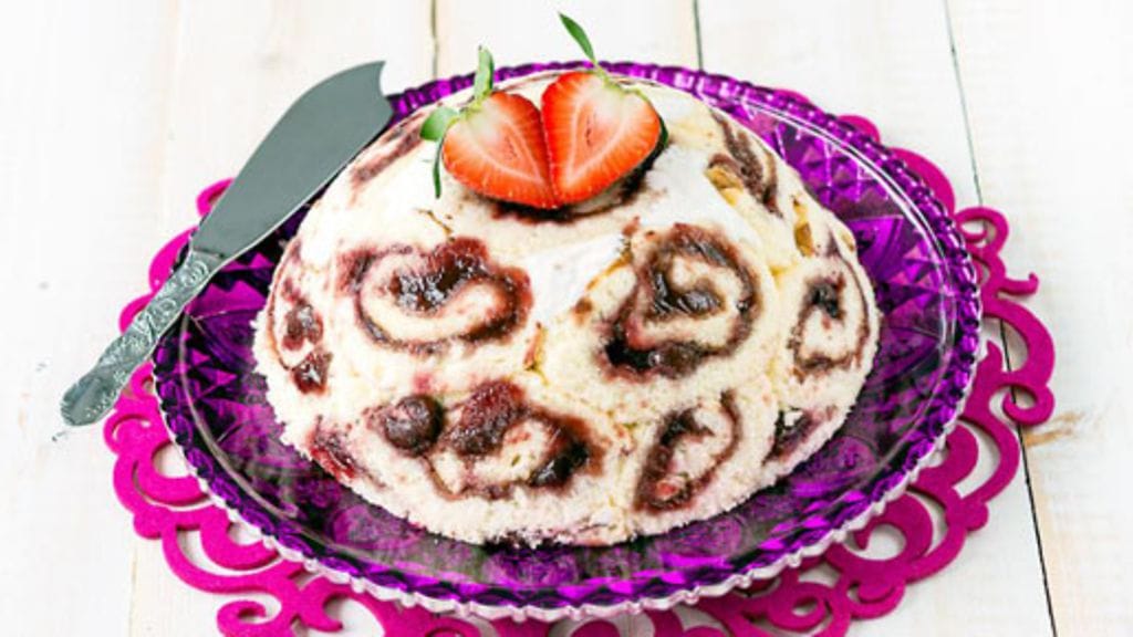 Laita kääretorttuviipaleet kulhoon vieretysten siten, että keskelle muodostuu tila täytteelle.