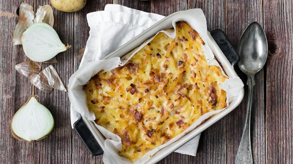 Laita seos uunivuokaan ja kypsennä 175-asteisessa uunissa noin 40 minuuttia, tai kunnes pinta on saanut väriä ja perunat ovat sopivan kypsiä.